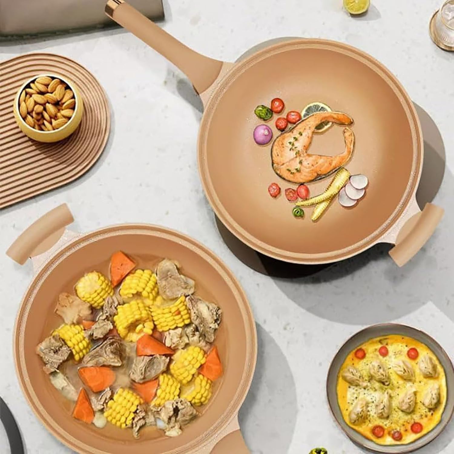 - Tips:1:Our food can cook fast. so please don't cook it on a high fire. Prolonged fire will change the coating color.Please note that all pots do not support long-term dry cooking, please check the food in the pot in time.2:when you first receive the new induction nonstick wok pan with lid,use warm water to clean, avoid using stainless steel scrubbing balls. Then wipe the body of the pot with oil, the coating is more non-sticky